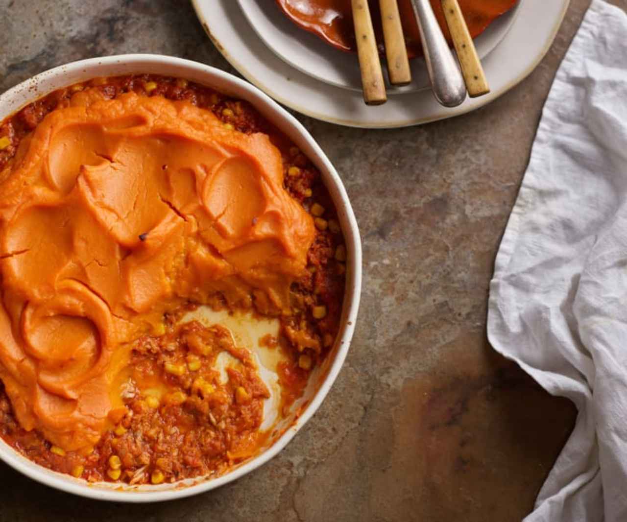 Empadão de atum e molho arrabiata com puré de batata-doce