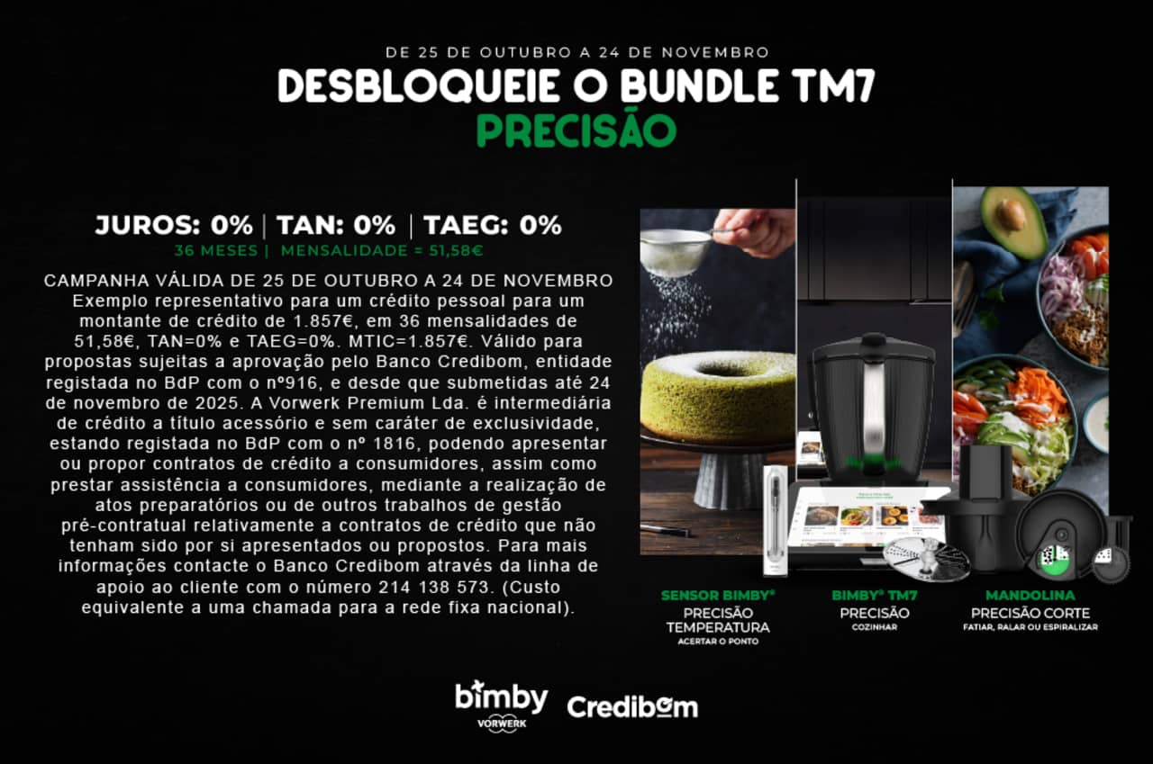 Gostava de cozinhar com a máxima precisão e sempre no ponto? Descubra uma oferta especial que inclui a Bimby® TM7, a Mandolina Bimby® e o Bimby® Sensor. Aproveite as condições especiais de financiamento - só até 24 de novembro de 2025. Contacte já um Agente Bimby® ou saiba mais no nosso site.