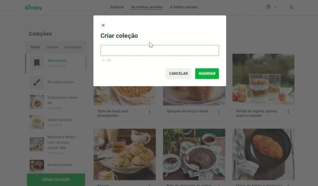 Criar as suas próprias coleções de receitas pode ser útil, especialmente se os membros da sua família tiverem diferentes preferências ou requisitos alimentares. Por exemplo, se tiver uma criança pequena em casa, pode reunir as receitas que a criança mais gosta numa coleção e poupar tempo. Ou no caso de ter um jantar de amigos para organizar, pode agrupar todas as receitas que deseja preparar para essa ocasião numa coleção denominada “Festa”. Não se esqueça de incluir uma receita de cocktail!