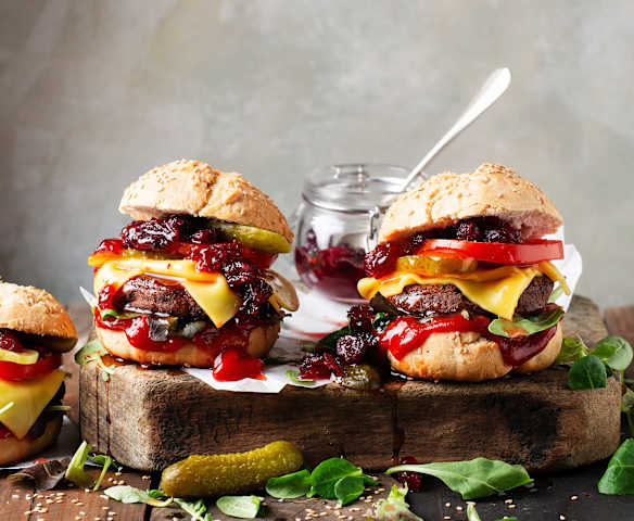 Hambúrgueres de feijão vegan com molho de mirtilos