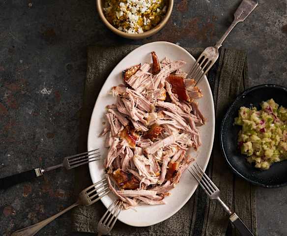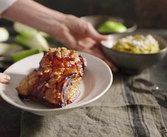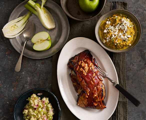 Barriga de porco no forno com maçã e puré de aipo e abóbora