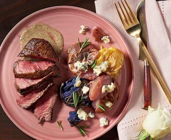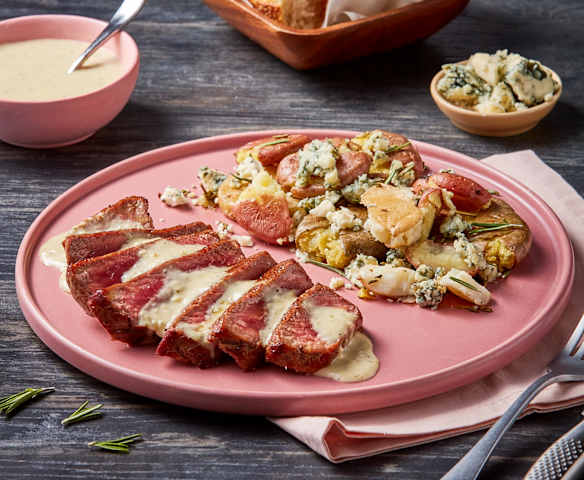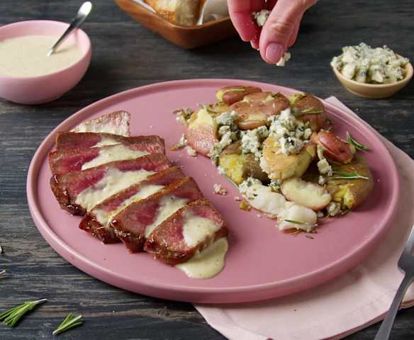 Steak with Peppered Parmesan Sauce and Roquefort Potatoes