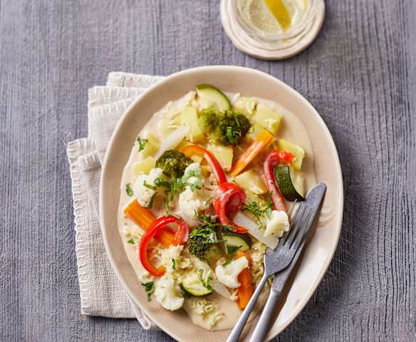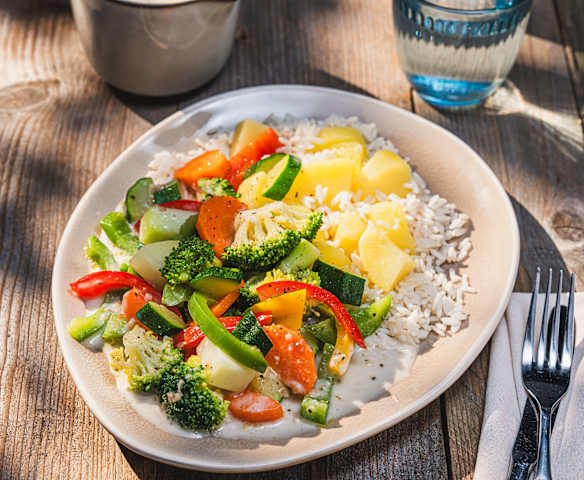 gemischtes Gemüse in Stücken (z. B. Möhren 1 cm, Zucchini 2-3 cm, Paprika 2-3 cm, Brokkoliröschen 2 cm, Kohlrabi 1-2 cm oder Blumenkohl 2 cm)500 g